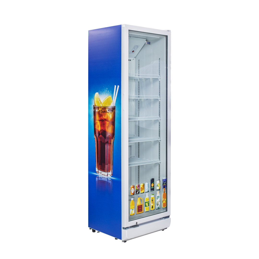 Commercial 350L display fridge with glass door for showcasing beverages and products.